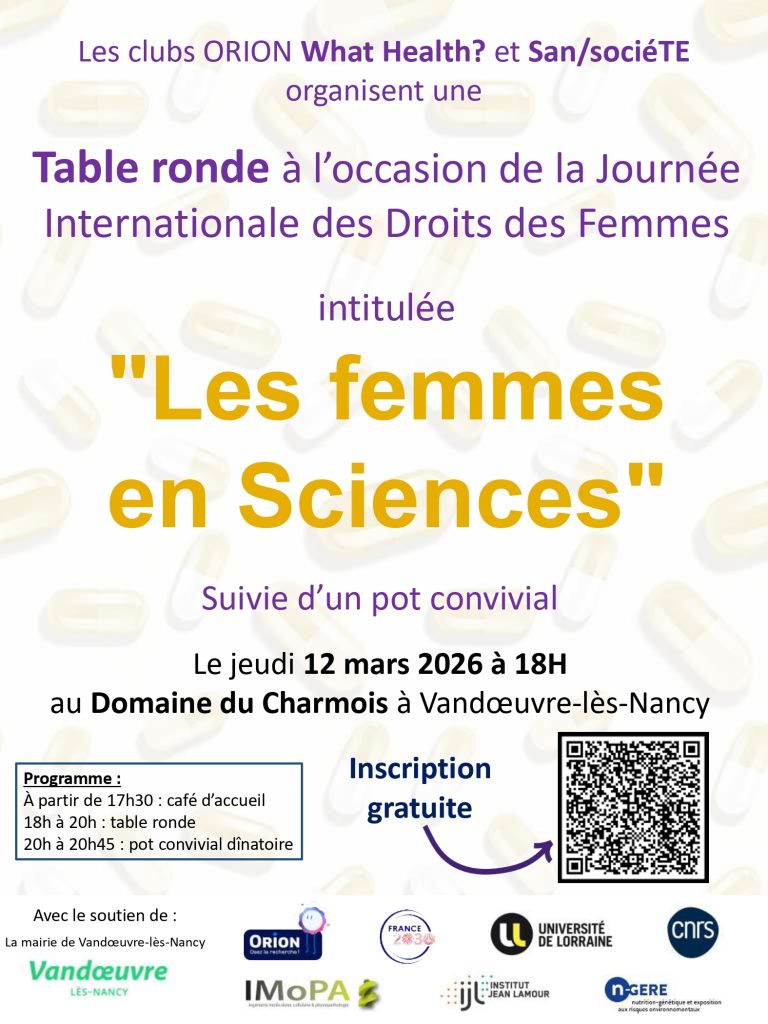 Dans la suite de la journée internationale des droits des femmes, les clubs ORION What Health? et San/sociéTE organisent une table ronde sur « les femmes en Sciences » le jeudi 12 mars 2026, de 18h à 20h00, au Domaine du Charmois à Vandœuvre-lès-Nancy. Cet événement réunira des femmes et des hommes travaillant dans des laboratoires de recherche pour échanger sur l’expérience des femmes dans le milieu scientifique et la vision des hommes sur les femmes en Sciences. Cette table ronde est organisée et sera animée par Astrid PINZANO (DR CNRS, IMoPA), Halima ALEM-MARCHAND (PU, IJL), Natacha DREUMONT (PU, nGERE), Nicolas POTIER (doctorant CNRS, IMoPA) et Lucas MEYER SYLLOS (doctorant, IJL).