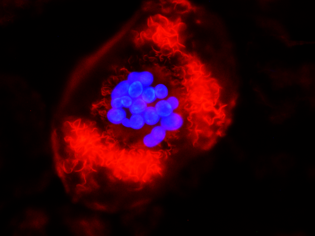 Multinucleated osteoclast and its actin filament network. Fluorescence microscopy image from HAL-03356534v1.